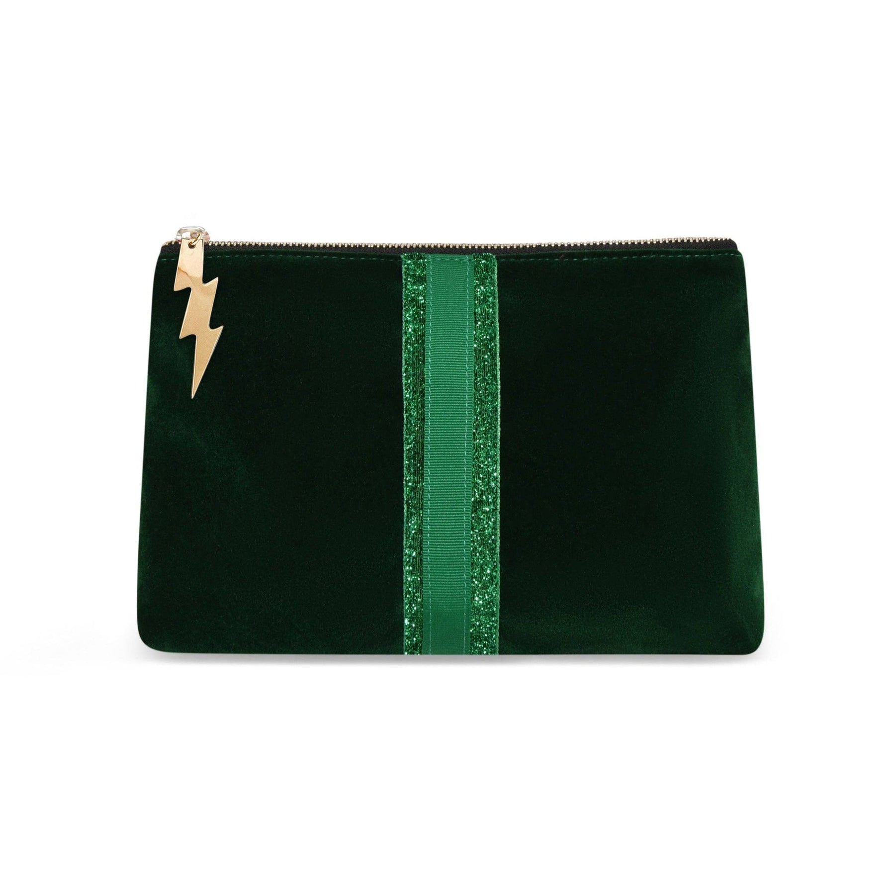 Rich bottle green velvet meets a subtle emerald glitter and grosgrain stripe for an effortlessly elegant clutch. Fully lined with Cockatoo’s signature hot pink lining and finished with the iconic lightning bolt zip pull. Chic, timeless and perfect for evenings out.