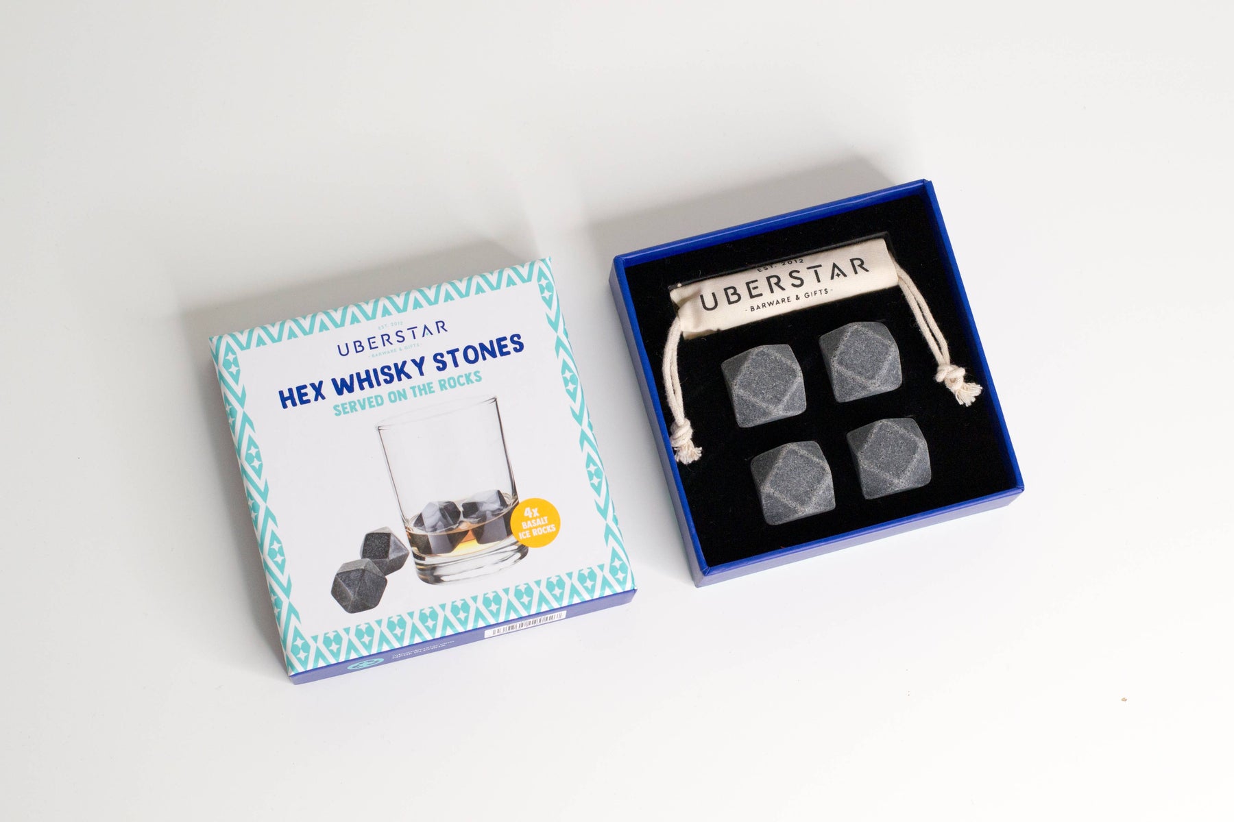 If you like your drinks cold, but don't want to water them down, this is the product for you. Simply store the Hex Whisky Stones in the freezer (min. of 2 hours). The next time you pour a drink, simply add the chilled stone to it. Ice cold drinks, zero dilution. 4x Basalt Stones Includes cotton freezer bag. Keep your drink cold with dilution. Hand washes only. Perfect for neat drinks. Presented in a branded gift box.