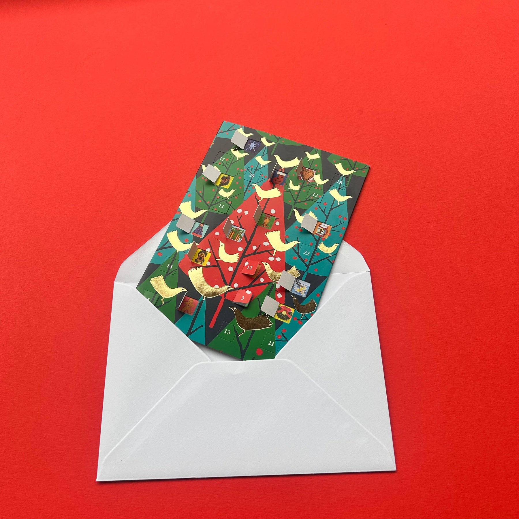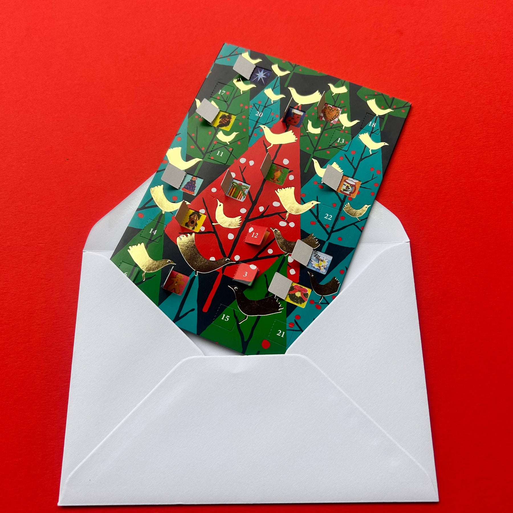Our Advent Calendar Cards are a charming hybrid between Christmas Card and Advent Calendar – and are a delight to receive! The same size as our standard cards, these gorgeously gold-foiled festive calendars include 24 die-cut windows revealing adorable illustrations. Simply write your message inside the card, pop them in an envelope, and post! This Advent Calendar Card features artwork by Roger la Borde; Product Details: 24 die-cut windows reveal hidden images; Printed on 250gsm FSC certified responsibly sourced board with 100gsm white woodfree paper envelope and packed in a recylcable bag; Gold foil blocked