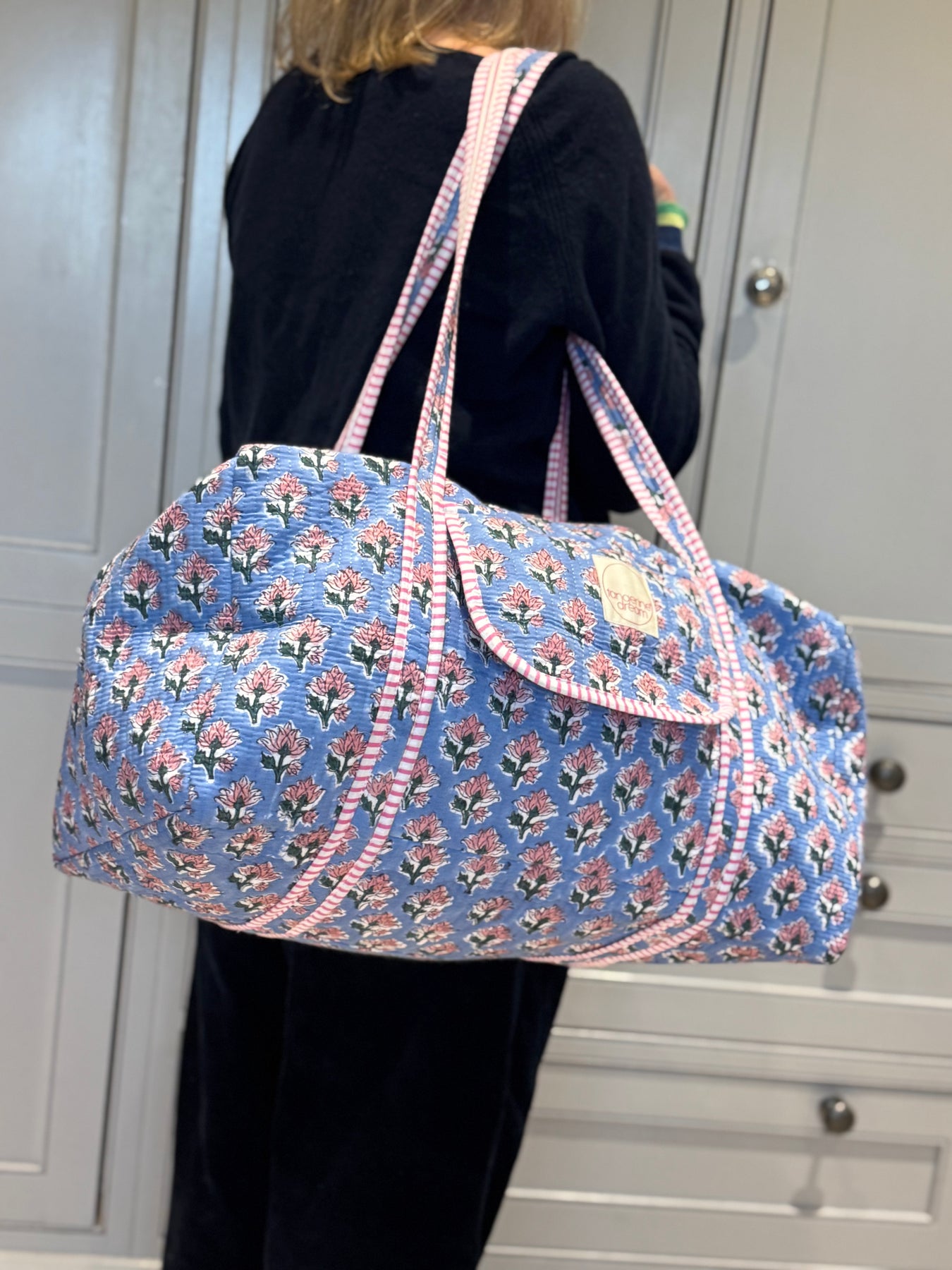 Introducing our signature handmade duffle bag—the perfect companion for your carry-on adventures or overnight getaways! Each bag is lovingly hand-dyed and hand-stamped, making it a unique piece crafted with care.